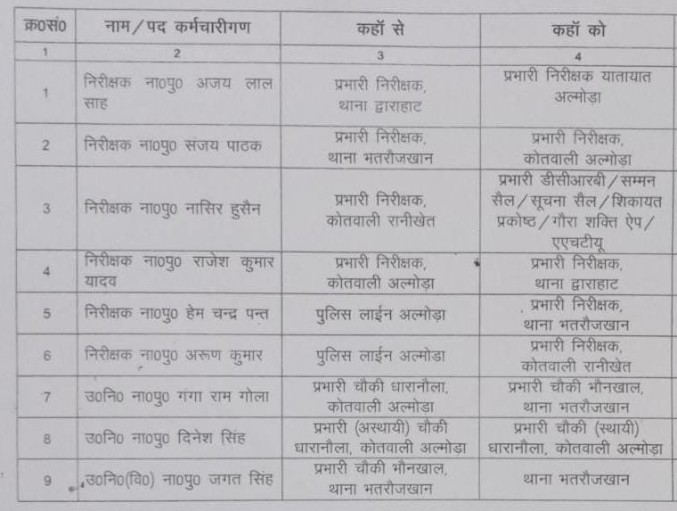 रचिता जुयाल एसएसपी अल्मोड़ा द्वारा 6 निरीक्षक और 3 उप निरीक्षकों का तबादला किया गया है।